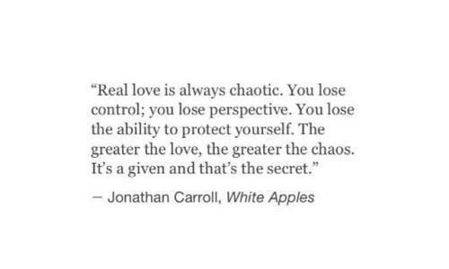 “Real love is always chaotic….The greater the love, the greater the chaos. It’s a given and that’s the secret.” – Jonathan Carroll